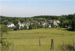 Wald heraustraten und das Häuserensemble von Oberhundem und eine