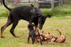 In den Spielphasen wird mal ein gut sozialisierter, erwachsener Hund der Erfahrung mit Welpen hat dabei